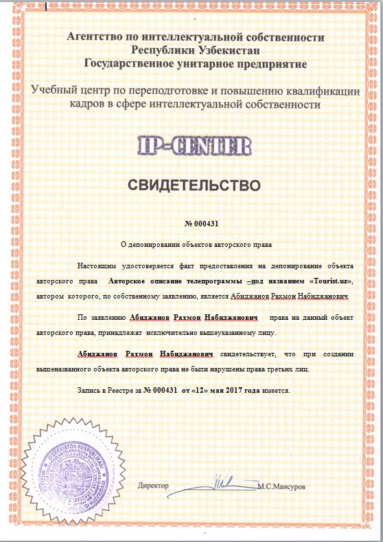 | 9732 | №000431 | Авторское описание телепрограммы –«Tourist.uz» | Абиджанов Рахмон Набиджанович. | Абиджанов Рахмон Набиджанович. | 05/12/2017 | ![]() |