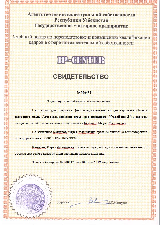 | 9731 | №000432 | Авторское описание игры –«Угадай кто Я?» | является Кашапов Марат Жамилевич | ООО “GRAFIKS-PRESS” | 05/15/2017 | ![]() |