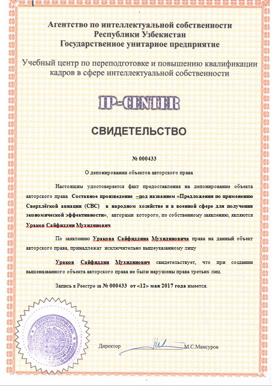 | 9730 | №000433 | Составное произведение –«Предложения по применению Сверхлёгкой авиации (СВС) в народном хозяйстве и в военной сфере для получения экономической эффективности» | Урақов Сайфиддин Мухидинович | Урақов Сайфиддин Мухидинович | 05/12/2017 | ![]() |