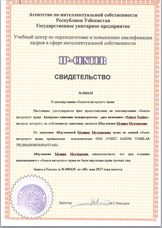 | 9725 | №000438 | Авторское описание телепрограммы – «SAHNADA» | Умурзаков Азизжон Мухаммаджонович | OOO «VODIY SADOSI YOSHLAR TELERADIOKOMPANIYASI» | 05.05.2017 | ![]() |