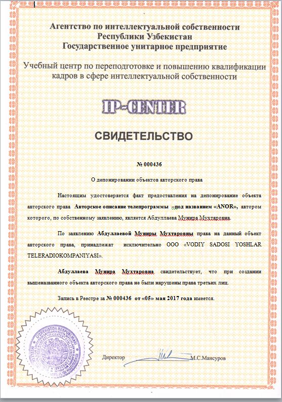 | 9727 | №000436 | Авторское описание телепрограммы –«ANOR» | Абдуллаева Мунира Мухтаровна | OOO «VODIY SADOSI YOSHLAR TELERADIOKOMPANIYASI» | 05/05/2017 | ![]() |
