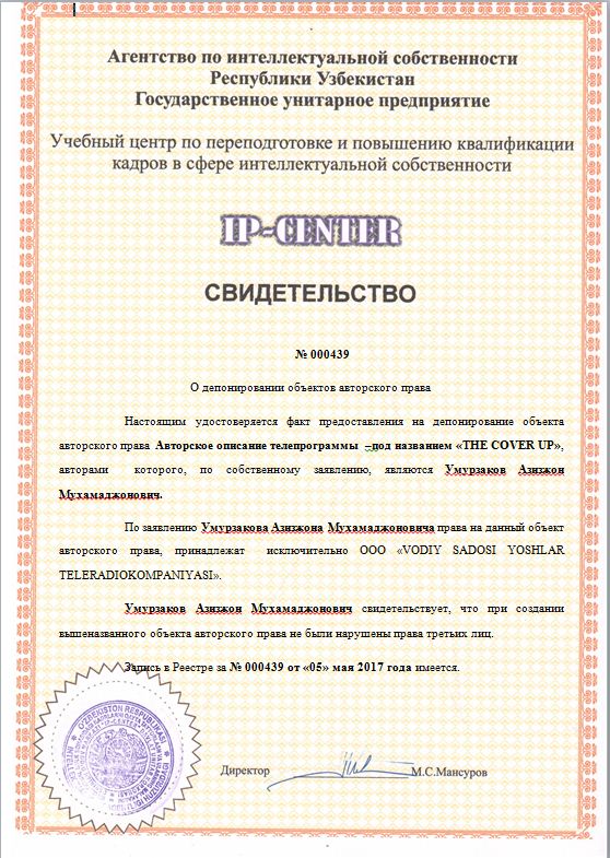 | 9724 | №000439 | Авторское описание телепрограммы –«THE COVER UP» | Умурзаков Азизжон Мухамаджонович | OOO «VODIY SADOSI YOSHLAR TELERADIOKOMPANIYASI» | 05/05/2017 | ![]() |