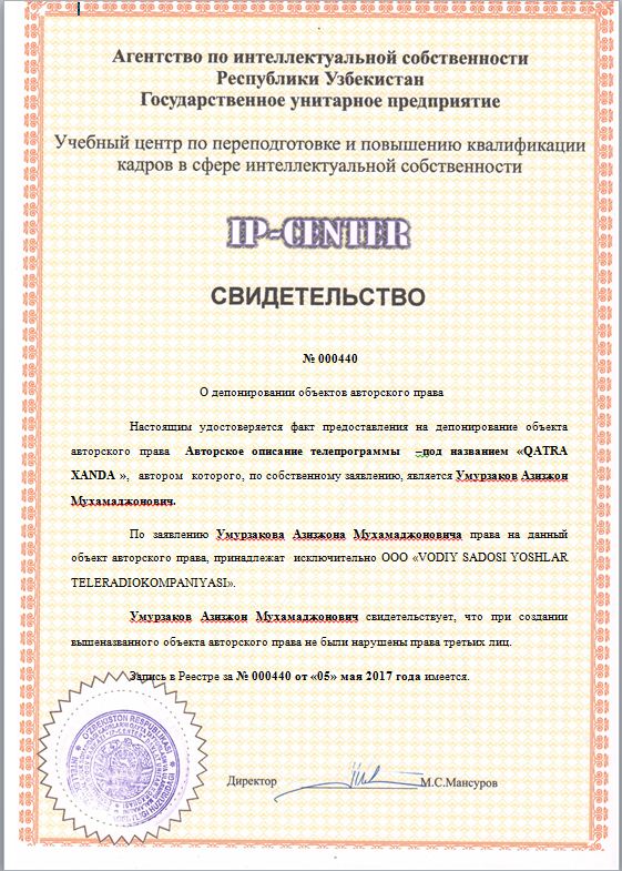 | 9723 | №000440 | Авторское описание телепрограммы –«QATRA XANDA » | Умурзаков Азизжон Мухамаджонович | OOO «VODIY SADOSI YOSHLAR TELERADIOKOMPANIYASI» | 05/05/2017 | ![]() |