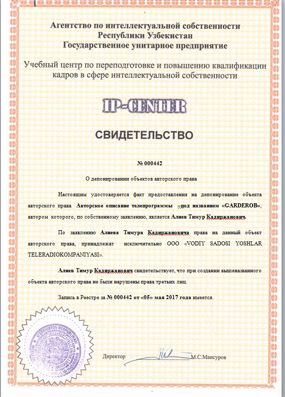 | 9721 | №000442 | Авторское описание телепрограммы –«GARDEROB» | Алиев Тимур Кадиржанович | OOO «VODIY SADOSI YOSHLAR TELERADIOKOMPANIYASI» | 05/05/2017 | ![]() |