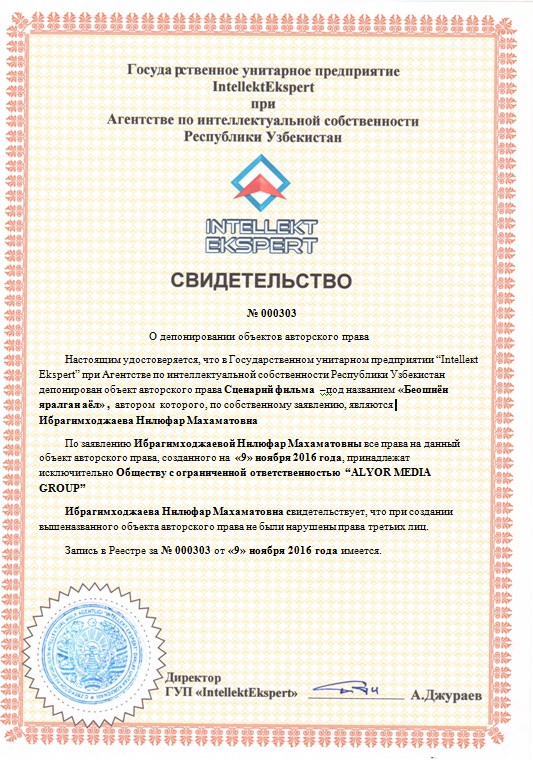 | 9860 | №000303 | Сценарий фильма –под названием «Беошиён яралган аёл» | Ибрагимходжаева Нилюфар Махаматовна | Общество с ограниченной ответственностью “ALYOR MEDIA GROUP” | 11/09/2016 | ![]() |