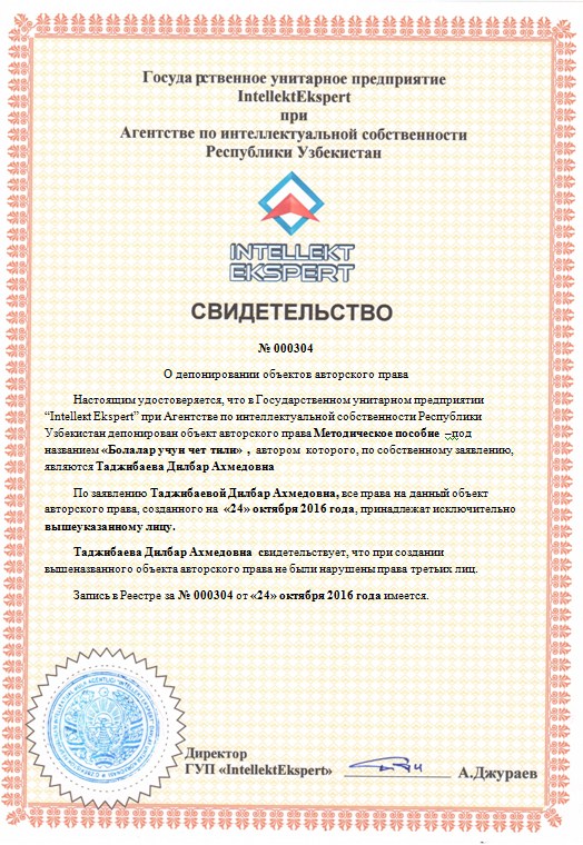 | 9859 | №000304 | Методическое пособие –под названием «Болалар учун чет тили» | Таджибаева Дилбар Ахмедовна | Таджибаева Дилбар Ахмедовна | 10/24/2016 | ![]() |