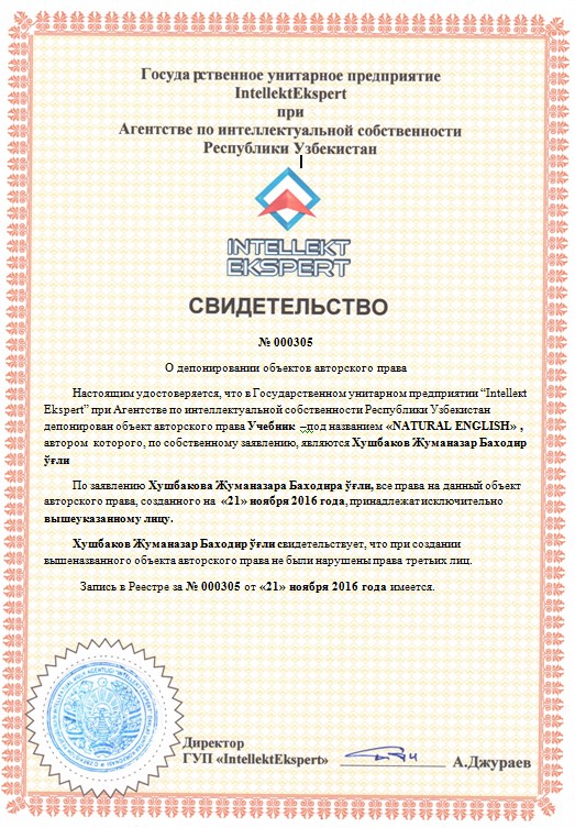 | 9857 | №000306 | Аудиовизуальный учебник –под названием «NATURAL ENGLISH» | Хушбаков Жуманазар Баходир ўғли | Хушбаков Жуманазар Баходир ўғли | 11/21/2016 | ![]() |