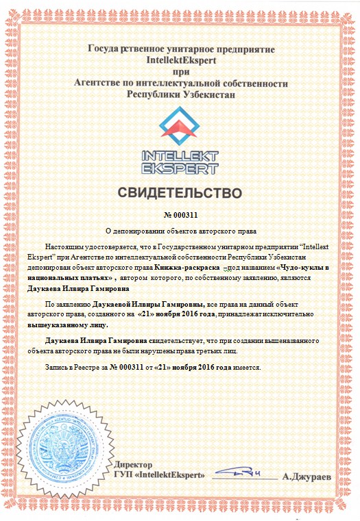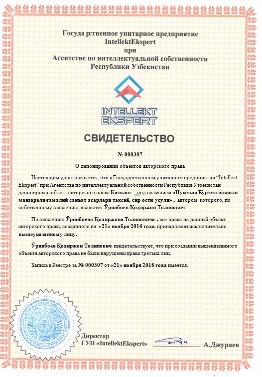 | 9856 | №000307 | Каталог –под названием «Нуқтали Бўртма нақшли манзарали ғамалий санъат асарлари таксиё, сир ости усули» | Ўринбоев Қодиржон Толипович | Ўринбоев Қодиржон Толипович | 11/21/2016 | ![]() |