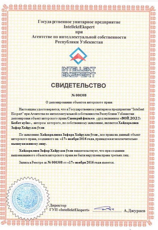 | 9855 | №000308 | Сценарий фильма –под названием «ВОЙ ДОД 2: Безбет куёв» | Хайдаралиев Зафар Хайрулла ўгли | Хайдаралиев Зафар Хайрулла ўгли | 11/17/2016 | ![]() |