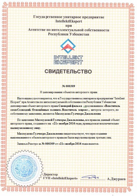 | 9854 | №000309 | Сценарий фильма –под названием «Властитель семи Созвездий. Освещённые солнцем. Властитель миров» | Махмудова Гулчехра Джалаловна | Махмудова Гулчехра Джалаловна | 11/21/2016 | ![]() |