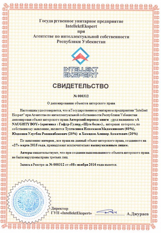 | 9851 | №000312 | Авторский перевод книги –под названием «A NAUGHTY BOY» (оригинал : Гафур-Гулям-«Шум бола») | Тухтасинов Илхомжон Мадаминович (60%), Юлдошев Улугбек Равшанбекович (20%) и Хамидов Алишер Ахматович (20%) | Тухтасинов Илхомжон Мадаминович, Юлдошев Улугбек Равшанбекович и Хамидов Алишер Ахматович | 11/08/2016 | ![]() |
