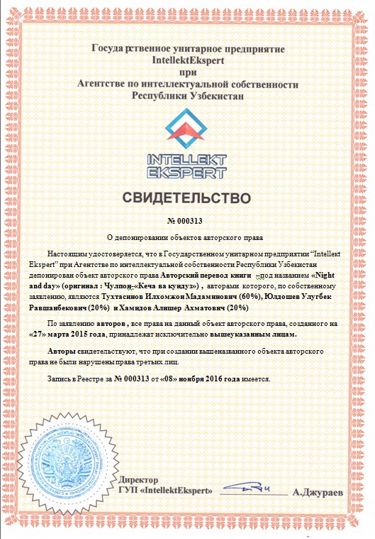 | 9850 | №000313 | Авторский перевод книги –под названием «Night and day» (оригинал : Чулпон-«Кеча ва кундуз») | Тухтасинов Илхомжон Мадаминович (60%), Юлдошев Улугбек Равшанбекович (20%) и Хамидов Алишер Ахматович (20%) | Тухтасинов Илхомжон Мадаминович, Юлдошев Улугбек Равшанбекович и Хамидов Алишер Ахматович | 11/08/2016 | ![]() |