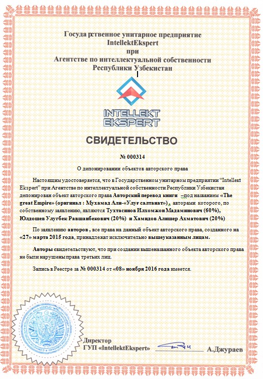 | 9848 | №000315 | Авторский перевод книги –под названием «The great Empire» (оригинал : Мухамад Али-«Сарбадорлар») | Тухтасинов Илхомжон Мадаминович (60%), Юлдошев Улугбек Равшанбекович (20%) и Хамидов Алишер Ахматович (20%) | Тухтасинов Илхомжон Мадаминович, Юлдошев Улугбек Равшанбекович и Хамидов Алишер Ахматович | 11/08/2016 | ![]() |