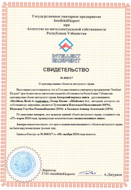 | 9846 | №000317 | Авторский перевод книги –под названием «Devildom. Book-4» (оригинал : Тохир Малик -«Шайтанат-4») | Тухтасинов Илхомжон Мадаминович (60%), Юлдошев Улугбек Равшанбекович (20%) и Хамидов Алишер Ахматович (20%) | Тухтасинов Илхомжон Мадаминович, Юлдошев Улугбек Равшанбекович и Хамидов Алишер Ахматович | 11/08/2016 | ![]() |