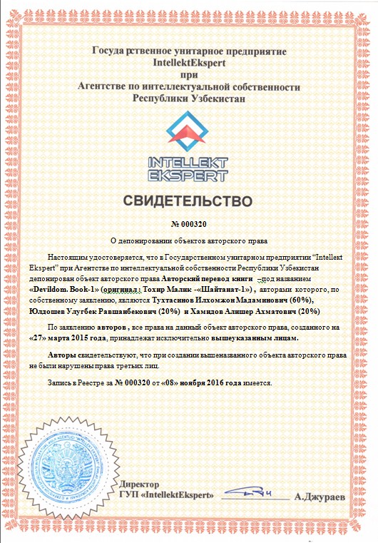 | 9843 | №000320 | Авторский перевод книги –под названием «Devildom. Book-3» (оригинал : Тохир Малик -«Шайтанат-1» | Тухтасинов Илхомжон Мадаминович (60%), Юлдошев Улугбек Равшанбекович (20%) и Хамидов Алишер Ахматович (20%) | Тухтасинов Илхомжон Мадаминович, Юлдошев Улугбек Равшанбекович и Хамидов Алишер Ахматович | 11/08/2016 | ![]() |