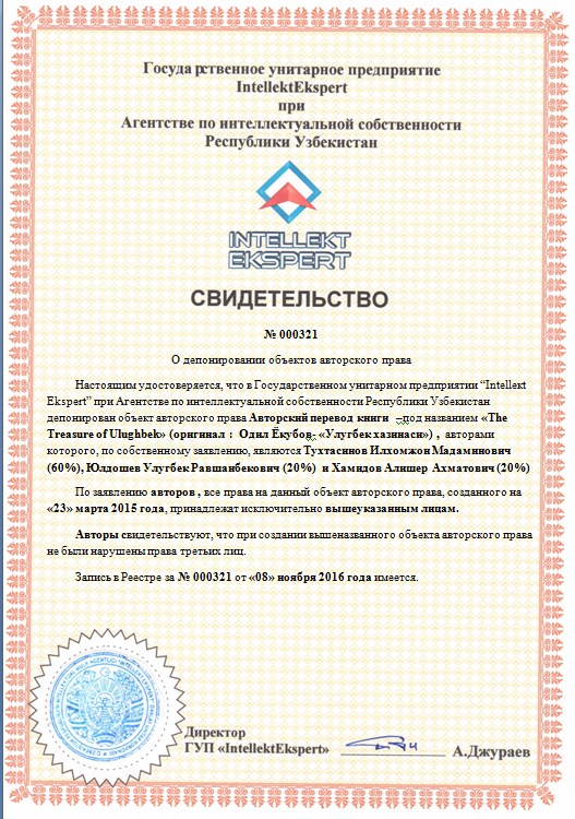 | 9842 | №000321 | Авторский перевод книги –под названием «The Treasure of Ulughbek» (оригинал : Одил Ёкубов- «Улугбек хазинаси») | Тухтасинов Илхомжон Мадаминович (60%), Юлдошев Улугбек Равшанбекович (20%) и Хамидов Алишер Ахматович (20%) | Тухтасинов Илхомжон Мадаминович, Юлдошев Улугбек Равшанбекович и Хамидов Алишер Ахматович | 11/08/2016 | ![]() |