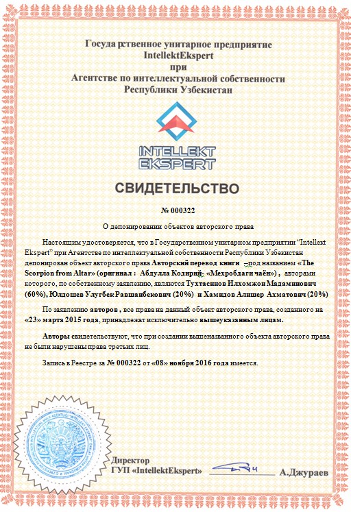 | 9841 | №000322 | Авторский перевод книги –под названием «The Scorpion from Altar» (оригинал : Абдулла Кодирий- «Мехробдаги чаён») | Тухтасинов Илхомжон Мадаминович (60%), Юлдошев Улугбек Равшанбекович (20%) и Хамидов Алишер Ахматович (20%) | Тухтасинов Илхомжон Мадаминович, Юлдошев Улугбек Равшанбекович и Хамидов Алишер Ахматович | 11/08/2016 | ![]() |