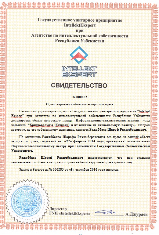 | 9880 | №000283 | Информационно-аналитическая записка –“Криптовалюты (биткоин) и их влияние на национальную валюту» | Ражаббаев Шароф Рахимбердиевич. | Ражаббаев Шароф Рахимбердиевич. | 09/05/2016 | ![]() |