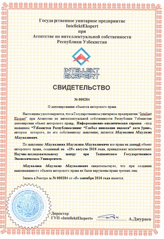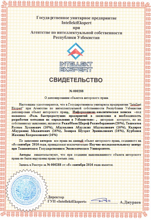 | 9875 | №000288 | Информационо-аналитическая записка –«Роль быстрорастущих предприятий в экономике и необходимость разработки методики их определения в Узбекистане» | Ражаббаев Шароф Рахимбердиевич (20%), Ташматов Рустам Хусанович (16%), Абдувалиев Абдулазиз Абдувалиевич (16%), Кадиров Абдурашид Маджитович (16%), Зокиров Шухрат Эркиналиевич (16%), Курбанов Жамшид Кахрамонович (16%) | Научно-исследовательному центру при Ташкентском Государственном Экономическом Университете. | 09/05/2016 | ![]() |