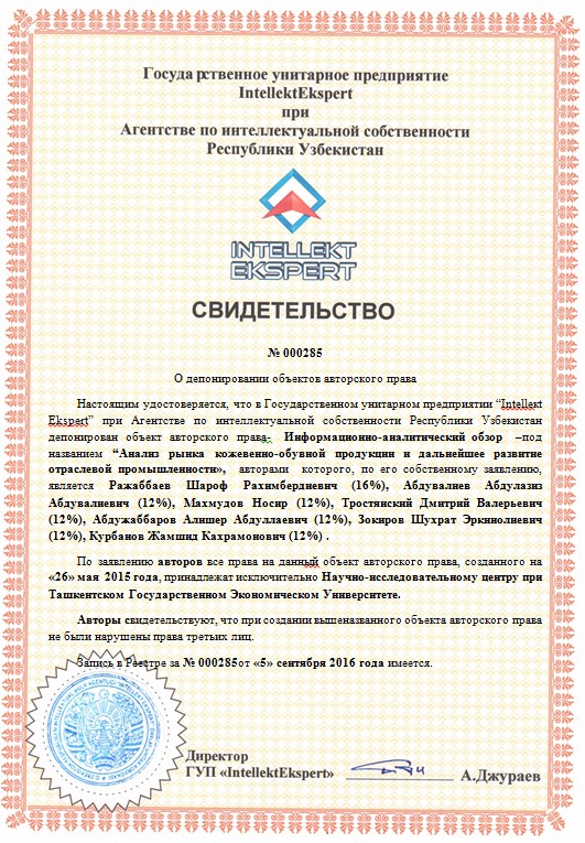 | 9878 | №000285 | Информационно-аналитический обзор –“Анализ рынка кожевенно-обувной продукции и дальнейшее развитие отраслевой промышленности» | Ражаббаев Шароф Рахимбердиевич (16%), Абдувалиев Абдулазиз Абдувалиевич (12%), Махмудов Носир (12%), Тростянский Дмитрий Валерьевич (12%), Абдужаббаров Алишер Абдуллаевич (12%), Зокиров Шухрат Эркинолиевич (12%), Курбанов Жамшид Кахрамонович (12%) . | Научно-исследовательному центру при Ташкентском Государственном Экономическом Университете. | 09/05/2016 | ![]() |