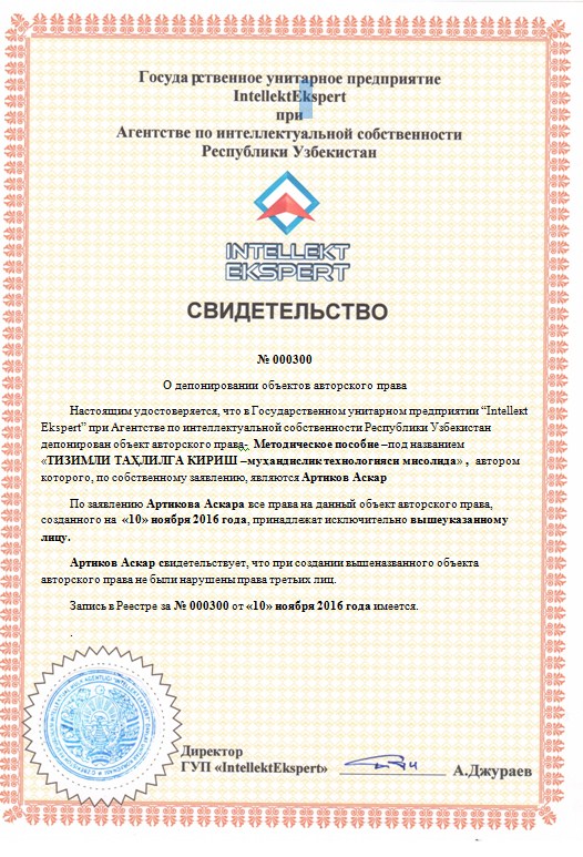 | 9863 | №000300 | Методическое пособие –под названием «ТИЗИМЛИ ТАҲЛИЛГА КИРИШ –муҳандислик технологияси мисолида» | Артиков Аскар | Артиков Аскар | 11/10/2016 | ![]() |