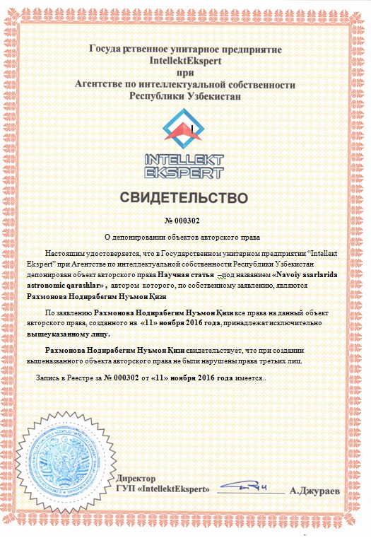 | 9861 | №000302 | Научная статья –под названием «Navoiy asarlarida astronomic qarashlar» | Рахмонова Нодирабегим Нуъмон Қизи | Рахмонова Нодирабегим Нуъмон Қизи | 11/11/2016 | ![]() |
