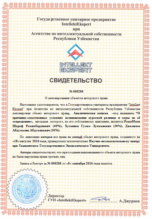 | 9877 | №000286 | Аналитическая записка –“О причинно-следственных условиях возникновения курсовой разницы и меры по её сокращению» | Ражаббаев Шароф Рахимбердиевич (40%), Хусаинов Гулам Лукманович (30%), Джалилов Абдумалик Абдуазизович (30%). | Научно-исследовательному центру при Ташкентском Государственном Экономическом Университете. | 09/05/2016 | ![]() |