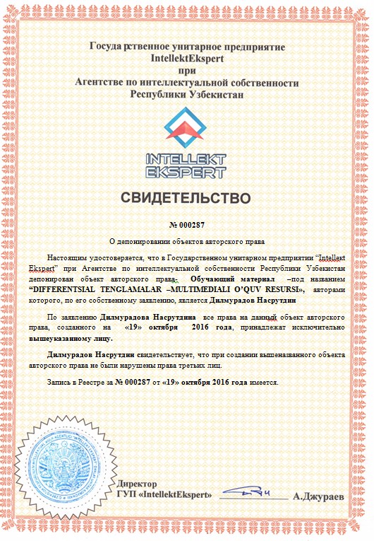 | 9876 | №000287 | Обучающий материал –“DIFFERENTSIAL TENGLAMALAR –MULTIMEDIALI O’QUV RESURSI» | Дилмурадов Насрутдин | Дилмурадов Насрутдин | 10/19/2016 | ![]() |