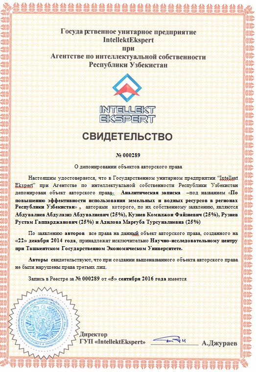 | 9874 | №000289 | Аналитическая записка –«По повышению эффективности использования земельных и водных ресурсов в регионах Республики Узбекистан» | Абдувалиев Абдулазиз Абдувалиевич (25%), Кузиев Комилжон Файзиевич (25%), Рузиев Рустам Гаппарджанович (25%) и Адилова Марғуба Турсуналиевна (25%) | Научно-исследовательному центру при Ташкентском Государственном Экономическом Университете. | 09/05/2016 | ![]() |