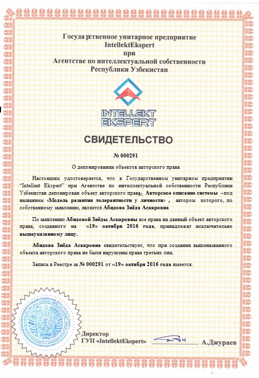 | 9872 | №000291 | Авторское описание системы –под названием «Модель развития толерантности у личности» | Абидова Зиёда Аскаровна | Абидова Зиёда Аскаровна | 10/19/2016 | ![]() |