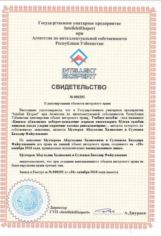| 9871 | №000292 | Учебное пособие –под названием «Қишлоқ хўжалигида ахборот-консалтинг маркази хизматларига бўлган талабни аниқлаш ҳамда уларни маркетинг асосида ривожлантириш» | Мухторов Абдухолик Халимович и Султанов Баходир Файзуллаевич | Мухторов Абдухолик Халимович и Султанов Баходир Файзуллаевич | 10/26/2016 | ![]() |