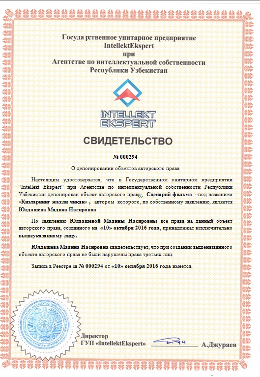 | 9869 | №000294 | Сценарий фильма –под названием «Қизларнинг жахли чиқди» | Юлдашева Мадина Насировна | Юлдашева Мадина Насировна | 10/10/2016 | ![]() |