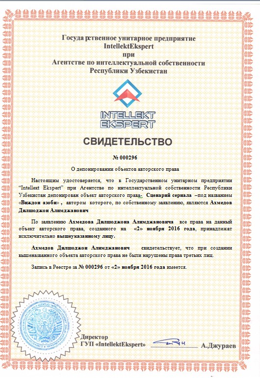 | 9867 | №000296 | Сценарий сериала –под названием «Виждон азоби» | Ахмедов Дилшоджон Алимджанович | Ахмедов Дилшоджон Алимджанович | 11/02/2016 | ![]() |