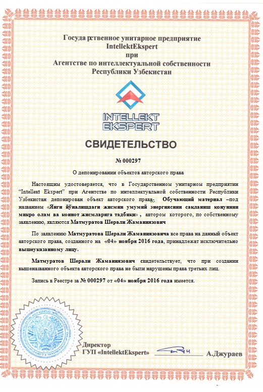 | 9866 | №000297 | Обучающий материал –под названием «Янги йўналишдаги жисмни умумий энергиясини сақланиш қонунини микро олам ва коинот жисмларига тадбиқи» | Матмуратов Шерали Жаманиязович | Матмуратов Шерали Жаманиязович | 11/04/2016 | ![]() |