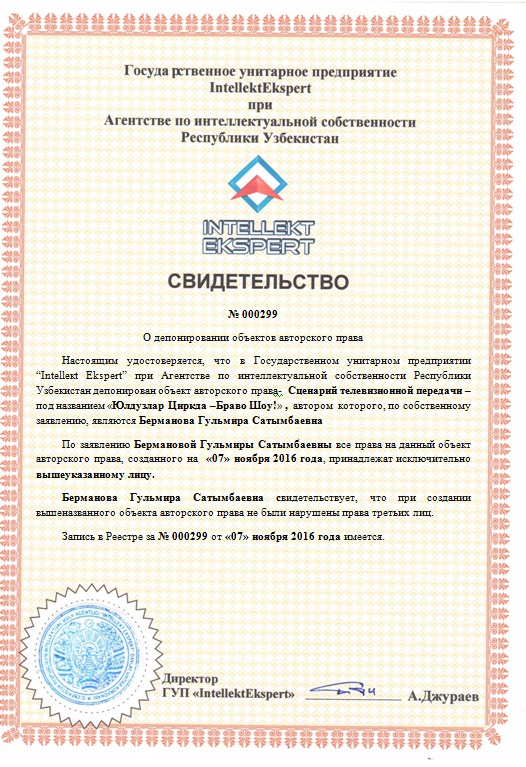 | 9864 | №000299 | Сценарий телевизионной передачи –под названием «Юлдузлар Циркда –Браво Шоу!» | Берманова Гульмира Сатымбаевна | Берманова Гульмира Сатымбаевна | 11/07/2016 | ![]() |