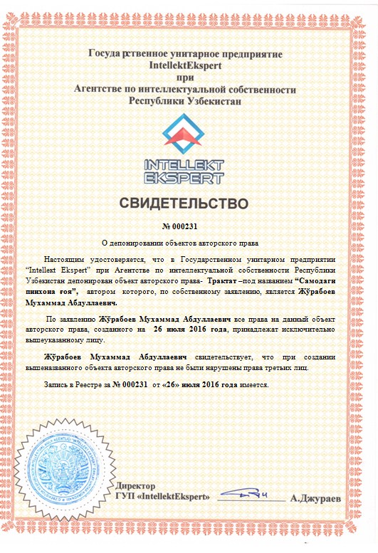 | 9932 | №000231 | Трактат –под названием “Самодаги пинхона ғоя” | Жўрабоев Мухаммад Абдуллаевич. | Жўрабоев Мухаммад Абдуллаевич. | 07/26/2016 | ![]() |