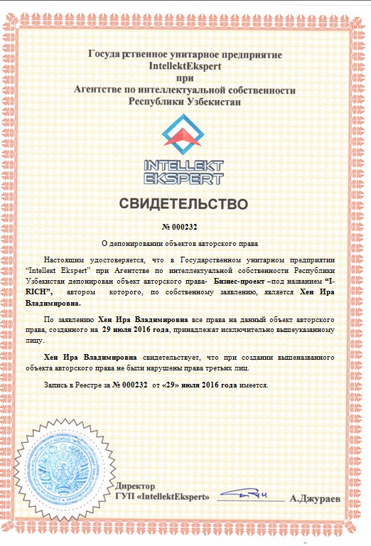 | 9931 | №000232 | Бизнес-проект –под названием “I-RICH” | Хен Ира Владимировна. | Хен Ира Владимировна. | 07/29/2016 | ![]() |