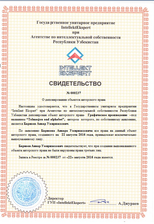 | 9926 | №000237 | Графическое произведение –под названием “Tolmasjon and alphabet” | Барноев Анвар Умиризахович. | Барноев Анвар Умиризахович. | 08/22/2016 | ![]() |