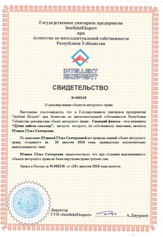| 9925 | №000238 | Сценарий фильма –под названием “Дўппи кийган одамлар” | Рўзиева Гўзал Саттаровна. | Рўзиева Гўзал Саттаровна. | 08/25/2016 | ![]() |