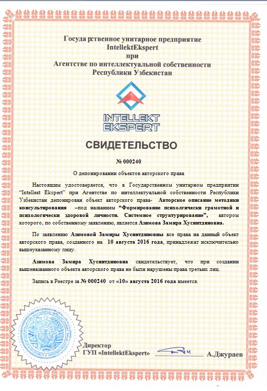 | 9923 | №000240 | Авторское описание методики консультирования –под названием “Формирование психолгически грамотной и психологически здоровой личности. Системное структурирование” | Азимова Замира Хуснитдиновна. | Азимова Замира Хуснитдиновна. | 08/10/2016 | ![]() |