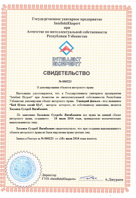 | 9940 | №000223 | Сценарий фильма – “Бой бўлма сахий бўл” | Хасанов Сухроб Янгибаевич | Хасанов Сухроб Янгибаевич. | 18.07.2016 | ![]() |