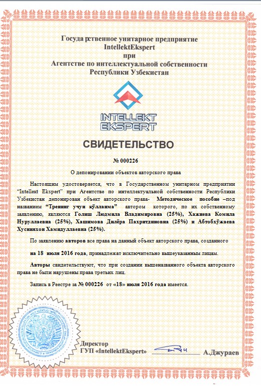 | 9937 | №000226 | - Методическое пособие – “Тренинг учун қўлланма” | Голиш Людмила Владимировна (25%), Хажиева Комила Нуруллаевна (25%), Хашимова Дилёра Пахритдиновна (25%) и Абтобхўжаева Хуснияхон Хамидуллаевна (25%). | Голиш Людмила Владимировна, Хажиева Комила Нуруллаевна, Хашимова Дилёра Пахритдиновна и Абтобхўжаева Хуснияхон Хамидуллаевна | 18.07.2016 | ![]() |