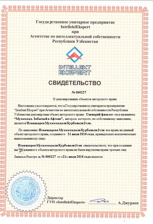 | 9936 | №000227 | Сценарий фильма –“Мухаммад. Забытый в Афгане” | Искандаров Мухаммадали Қурбонали ўгли | Искандаров Мухаммадали Қурбонали ўгли | 21.07.2016 | ![]() |