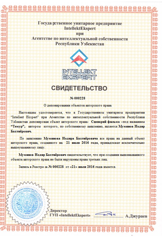 | 9935 | №000228 | Сценарий фильма – “Темур” | Муминов Нодир Бахтиёрович | Муминов Нодир Бахтиёрович | 21.07.2016 | ![]() |