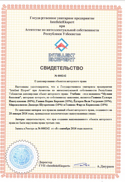 | 9921 | №000242 | Учебник –под названием “Мулкни бахолаш” | Ганиева Гулсара Инатуллаевна (60%), Ганиев Карим Барович (10%), Ёдгаров Вали Умурович (10%), Мирджалилова Дилдора Шухратовна (10%) и Ганиева Фируза Каримовна (10%) | Ганиева Гулсара Инатуллаевна , Ганиев Карим Барович , Ёдгаров Вали Умурович , Мирджалилова Дилдора Шухратовна и Ганиева Фируза Каримовна | 09/05/2016 | ![]() |