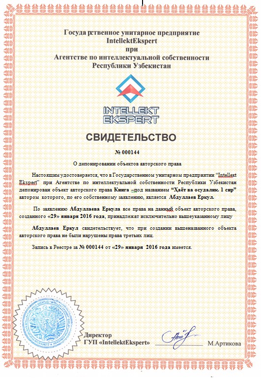 | 10019 | №000144 | Книга-“Ҳаёт ва осудалик. 1 сир” | Абдуллаев Еркул. | Абдуллаев Еркул. | 01/29/2016 | ![]() |