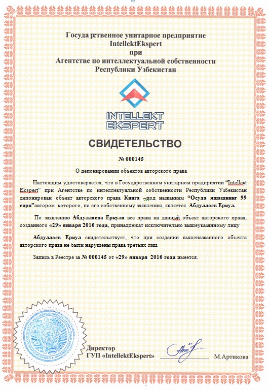 | 10018 | №000145 | Книга-“Осуда яшашнинг 99 сири” | Абдуллаев Еркул. | Абдуллаев Еркул. | 01/29/2016 | ![]() |