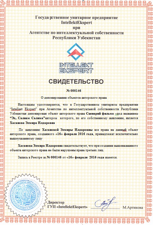 | 10006 | №000157 | Сценарий фильма –“Севги сотилмас ” | Ширинова Зарина Салимовна. | Ширинова Зарина Салимовна. | 03/10/2016 | ![]() |