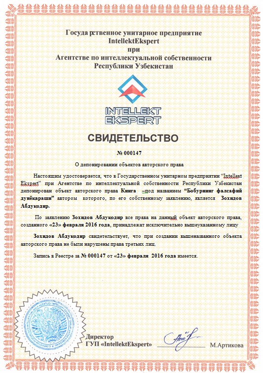 | 10020 | №000143 | Сценарий фильма –“Фирибгар ошиқ" | Шарапов Бурхонжон Абдурахманович. | Шарапов Бурхонжон Абдурахманович. | 02/09/2016 | ![]() |