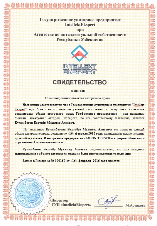 | 10013 | №000150 | Графическое произведение –“Синяя шкатулка” | Кулимбетов Бахтиёр Мухамед Алиевич. | Иностранное предприятие «LORIN TEKSTIL» в форме общества с ограниченной ответственностью | 02/16/2016 | ![]() |